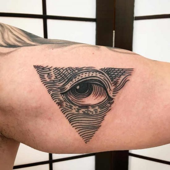 De betekenis van oog tattoos. In veel culturen staat het oog symbool voor schoonheid. Een tatoeage van een oog wordt vaak gezien als het alziende oog of de all-seeing eye of Eye of Providence. Het oog van god dat waakt over de mens. Een driehoek is een vorm met veel symboliek op zich. Een oog in een driehoek is het pad naar verlichting, inzicht.