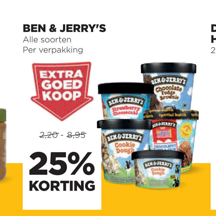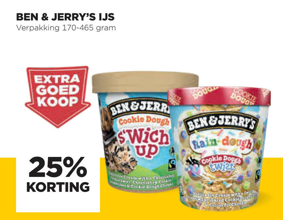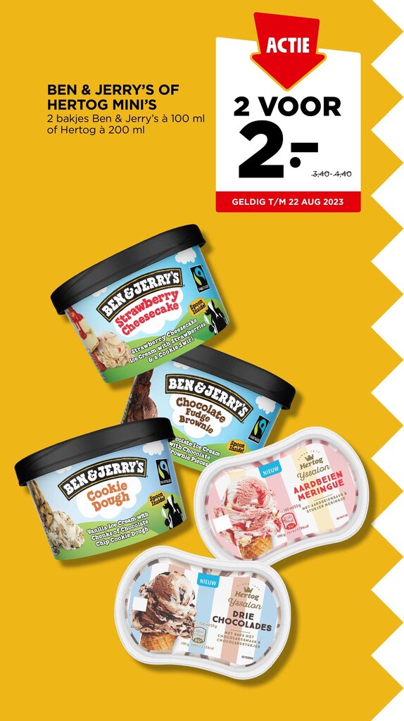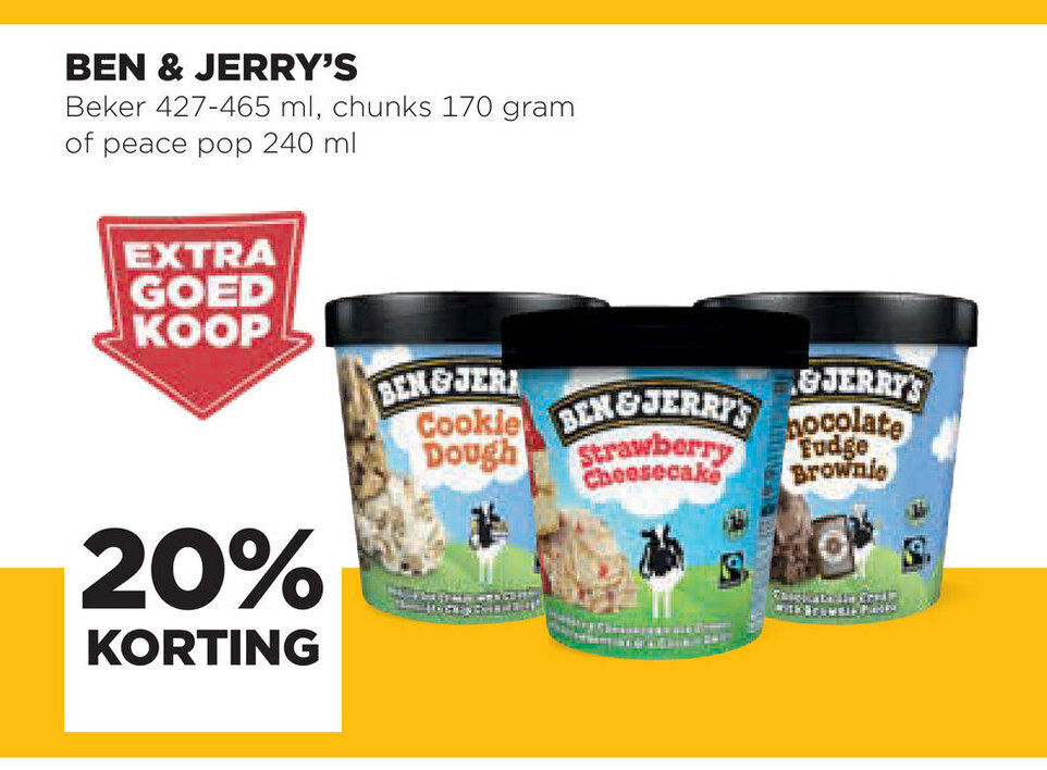 Actuele Ben & Jerry's aanbiedingen en kortingen van april 2024 Bespaar geld op je volgende aankoop Jouw sociale shopping community Pepper.com. Vanaf 16 augustus bij de Jumbo: 2 Ben&Jerry's mini voor €2 Voor een mini prijsje, maar wel de volle smaak. Inclusief lepeltje.