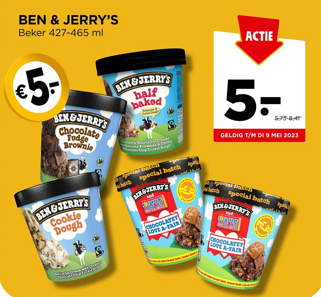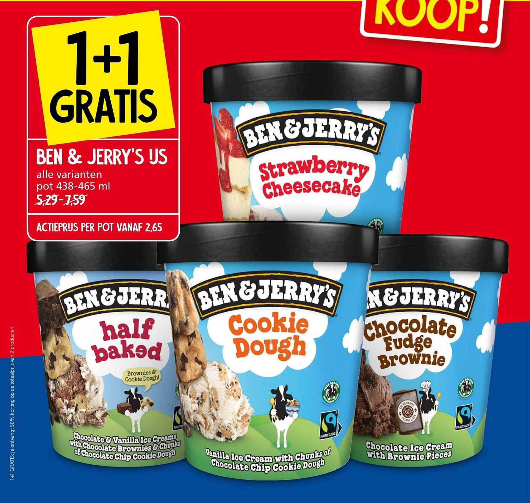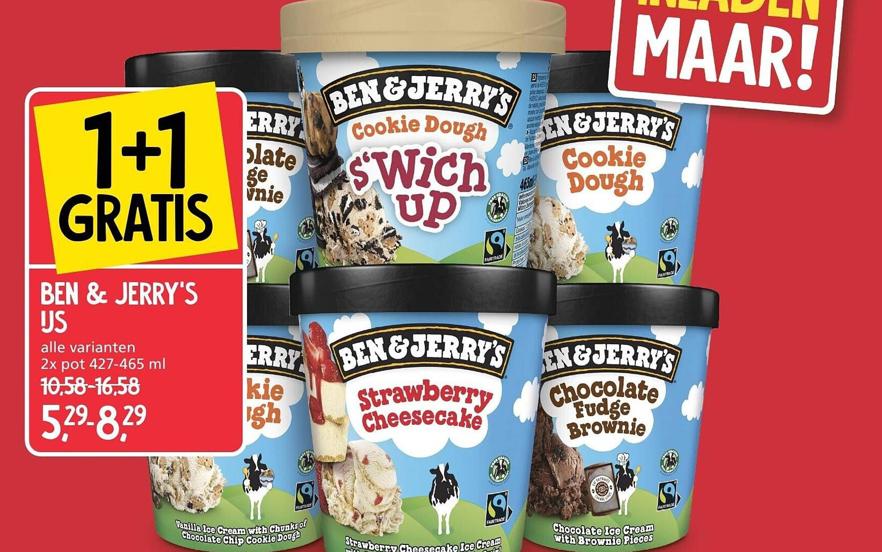 Aanbiedingen voor ben and jerry. Op deze pagina staan de actuele prijzen van ben and jerry producten, waarvan er nu 10 in de aanbieding zijn en in de folders staan. Aanbiedingen worden met een oranje kader uitgelicht. Verder krijg je via het knopje prijshistorie inzicht in het aanbiedingsritme van vele producten.
