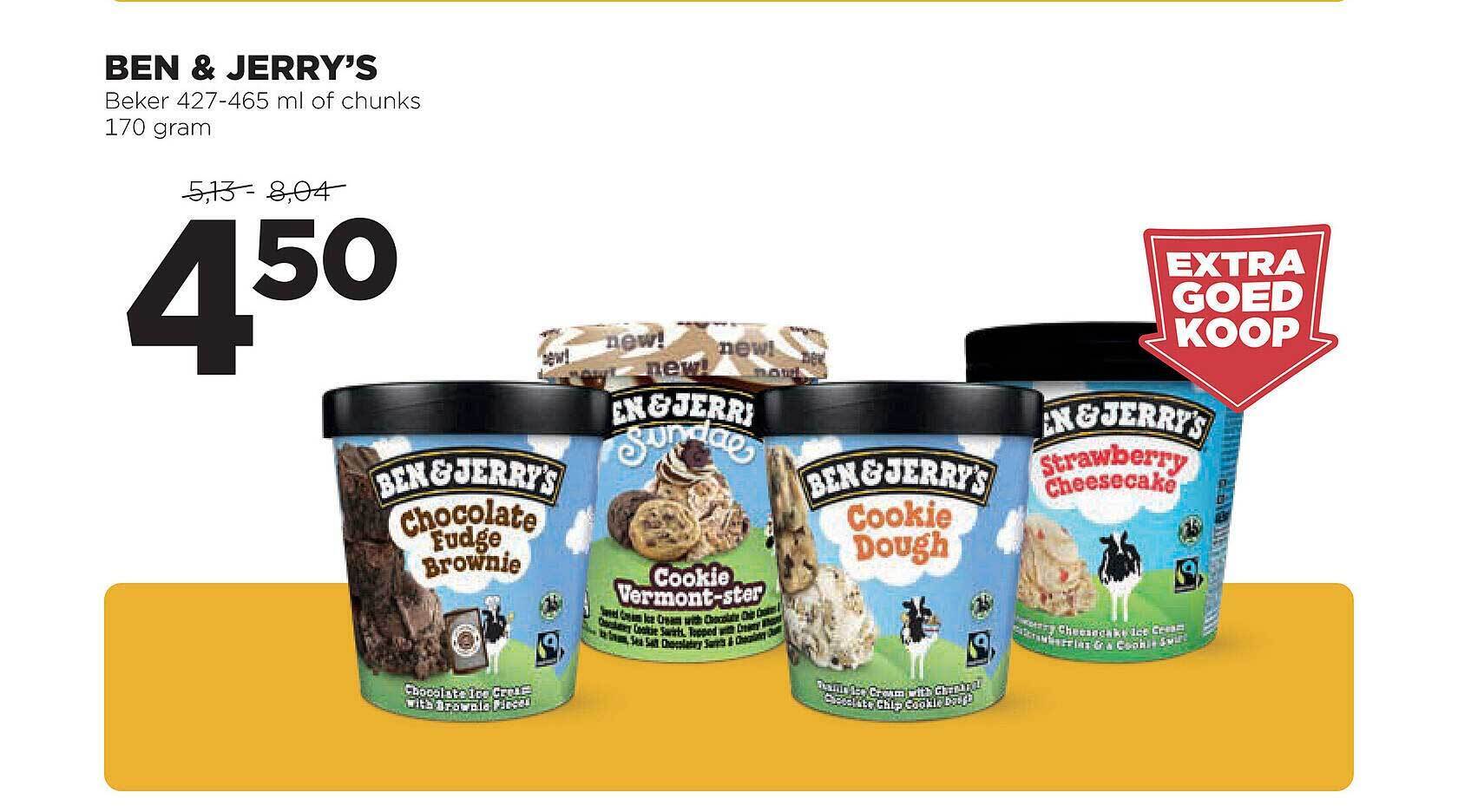 BEN & JERRY'S. Verlopen! € 5,00. Actuele BEN & JERRY'S aanbieding bij Jumbo uit de folder. Bekijk de nieuwste BEN & JERRY'S aanbieding hier en koop de goedkoopste BEN & JERRY'S aanbiedingen voor de beste prijs. Bekijk in de folder. Geldig: 10 apr 2024 tot en met 16 apr 2024. Prijs en voorwaarden zoals vermeld in de Jumbo folder of Jumbo.