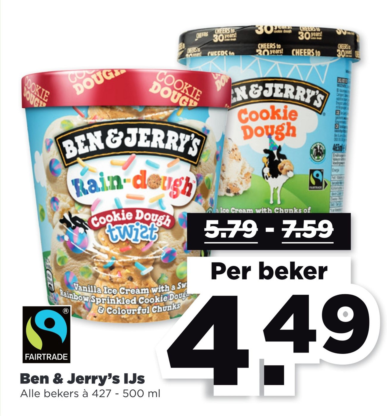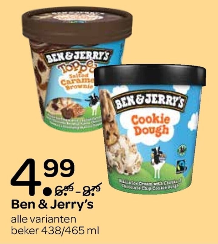 Ben & Jerry's IJs Cookie Dough 465ml. 406 g. 6,26. 5 00. 10,75/liter. 1 voor € 5,00. Bekijk aanbieding. Geldig van wo 3 t/m di 30 apr. Bij boodschappen bestellen geldt de aanbieding voor bezorg- en ophaalmomenten op wo 3 t/m di 30 apr.
